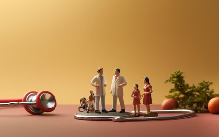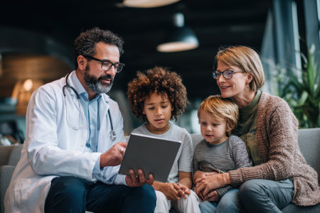 Doctor discusses health report with family using a tablet in a cozy clinic setting, fostering understanding and support for the children's well-being