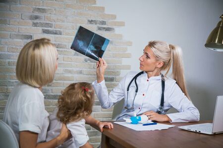 Professional medical pediatrician doctor in white uniform consult mother with her daughter. Pediatrist exam x-ray picture of kid patient