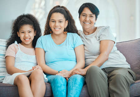One smile, three faces. Shot of a mature woman bonding with her daughter and granddaughter on a sofa at home.