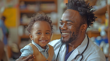 Hospital and doctors help: Portrait of smiling african american male doctor and his daughter
