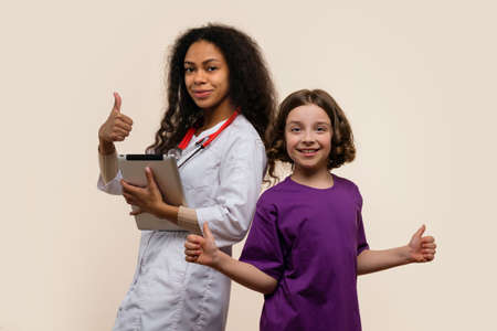 Friendly Dark Skinned Woman Doctor in Uniform and Child Showing Thumb Up, Like Ok Sign. African American Female Pediatrician with Digital Tablet and Happy Girl Patient on Light background