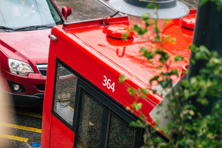 Budapest Hungary july 17, 2020 View of a traditional Hungarian red trolleybus for passengers driving under the rain through the streets of Budapest, the capital of Hungary