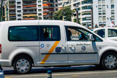 Seville Spain July 02, 2021 Taxi driving through the streets of Seville, an emblematic city and the capital of the region of Andalusia, in the south of Spain