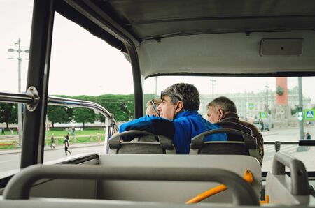 Saint Petersburg, RUSSIA - July 08, 2018: Tourists go to the tour bus and look out the window. Tourism in St. Petersburg, Russia.