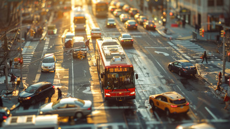 A busy city street filled with cars and buses during sunset, representing urban life and evening rush hour