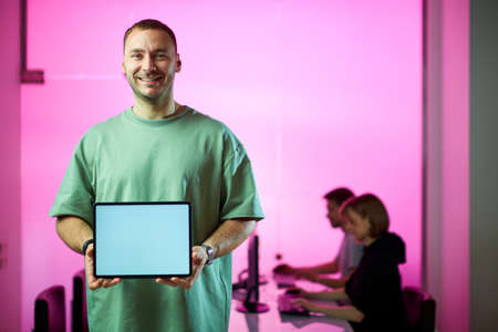 Female prosperous financier holding touch pad with empty mock up copy space screen background for advertising text message while sitting at workstation in office interior. Digital tablet with display