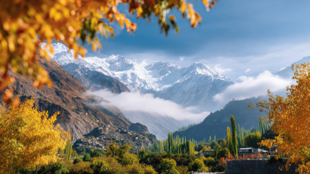 Experience a breathtaking view of a serene mountain landscape adorned with vibrant autumn foliage, majestic snow-capped peaks, and a tranquil valley.