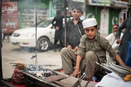 BESHAM, PAKISTAN - April 15, 2018: Unidentified children selling grilled meat on the street market