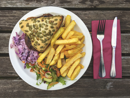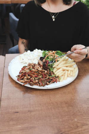 Closeup of grilled pork steak with salad on a plate, frenchfries and salad vegetables
