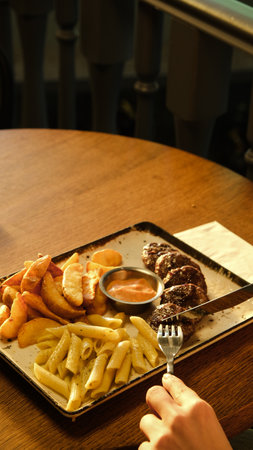 A man eats meat cutlets with mashed potatoes in a restaurant