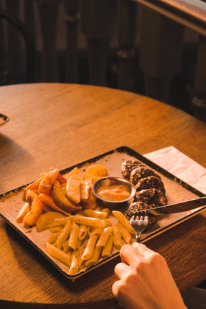 Close-up of hands of friends eating potatoes togheter while having fun in the restaurant.