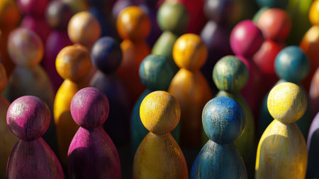A collection of colorful wooden figures stands closely together symbolizing diversity and community spirit each figure unique in color and design.