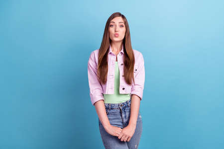 Photo of young funny girl pouted lips have fun carefree grimacing isolated over blue color background