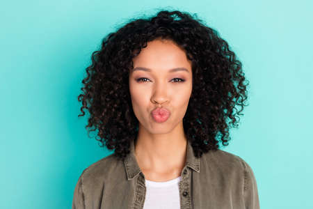 Young brunette woman making kiss lips and looking at camera isolated over blue wall