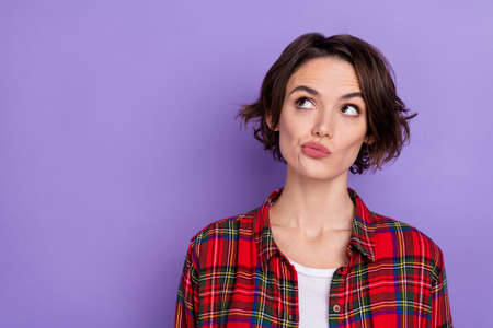 Photo of thinking young bob hairdo lady look empty space wear red shirt isolated on violet color background
