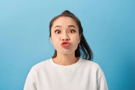 panoramic shot of girl with duck face isolated on blue