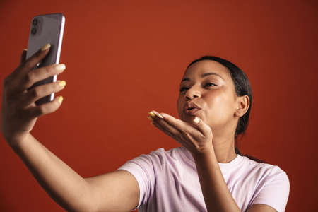Black woman blowing air kiss while taking selfie on cellphone isolated over red wall