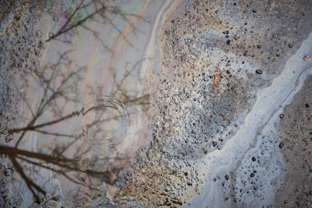 Colorful spot of oil or gasoline spill in a puddle with shadows from trees after rain
