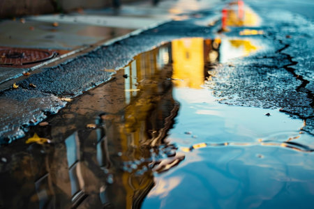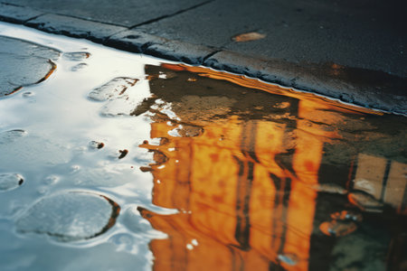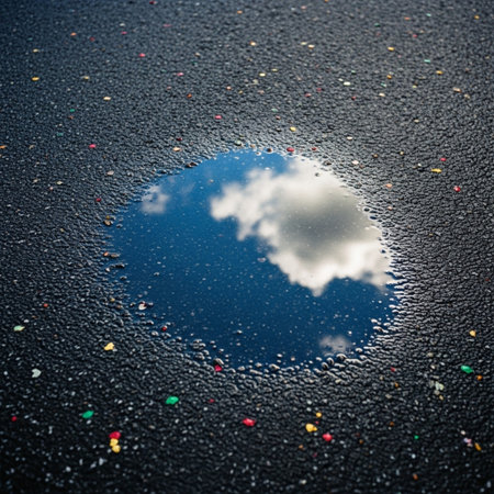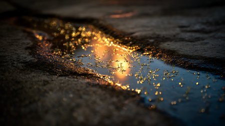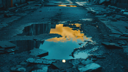 wet asphalt with puddles and reflections of the sky, creating a hypnotizing effect, created with generative ai