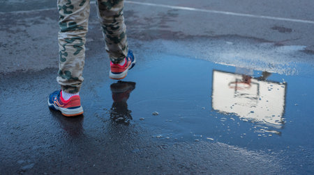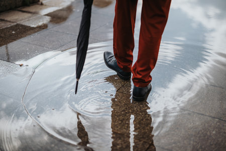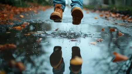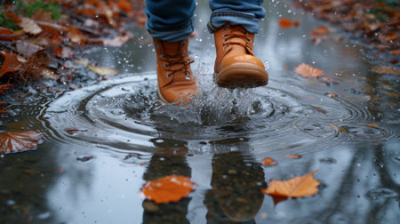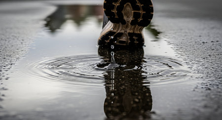 Feet in dark shoes stepping into a large puddle, creating a dynamic water splash with droplets flying in the air. outdoor activity on a wet day.