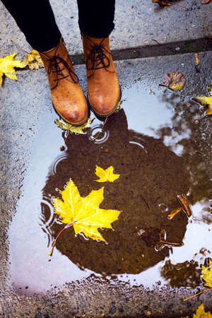 Autumn fallen yellow leaves lie in a puddle in the rain. Raindrops on the surface of the water. Autumn background.