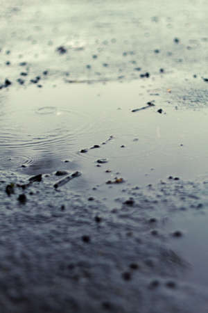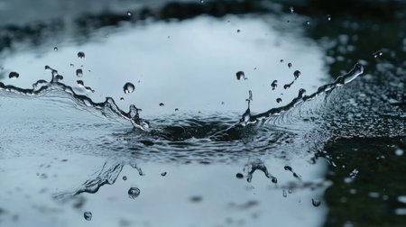 This close-up image captures raindrops falling into a puddle, creating beautiful ripples and reflections on the surface, showcasing nature