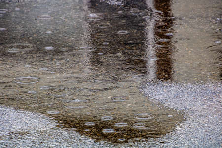 Rain falls on the road and creats puddles. Calgary, Alberta, Canada