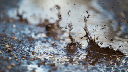 A closeup of mud splatter on the edge of a puddle showing the small grainy particles and droplets creating a spotty and uneven texture