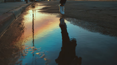 An atmospheric city street scene captures a serene reflection in a puddle after rain, accentuating the quiet elegance of urban life at dusk.