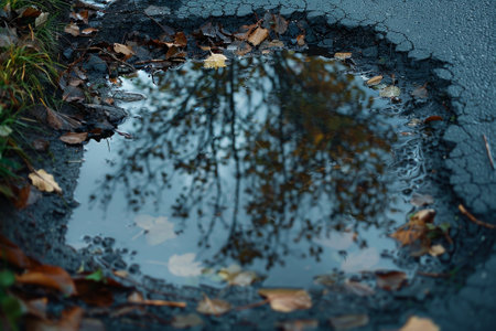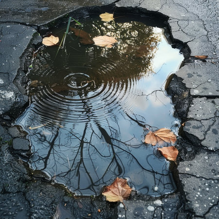 Ripples spread in a water puddle reflecting trees, on a cracked asphalt surface with scattered leaves.