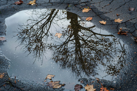 mesmerizing puddle reflects the vast expanse of the sky, creating a serene and surreal scene on the side of a quiet road.