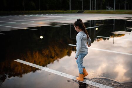 Rainy day in the city. A girl in a rubber boots stands in a puddle with red hearts.