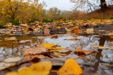 beautiful autumn landscape, closeup of colorful leaves in a forest, leaves on the surface of a puddle of water, cloudy weather