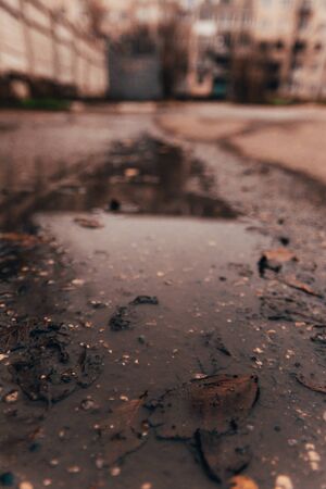 Puddle on a city street with trees reflecting in it after rain during a spring day – Small pond with water on a sidewalk – Urban wet asphalt with cracks and holes in it