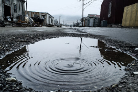 A puddle forms in the middle of a deserted street as raindrops create concentric circles, highlighting the gray day.