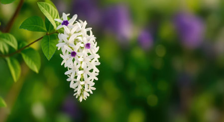A close-up of a cascading cluster of small white flowers with tiny purple centers, set against a blurred green and purple background.