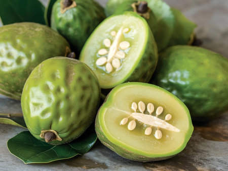 Close-up of fresh green noni fruit, some whole and one cut open, showcasing seeds and leaves.