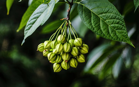 Close up of a bunch of unripe green seed pods on a tree