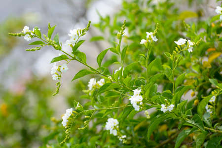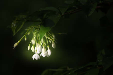 White flowers of Wild Water Plum are blooming on bush and blur leaves background. Wondrous Wrightia flowers have fragrance in the morning, Thailand.