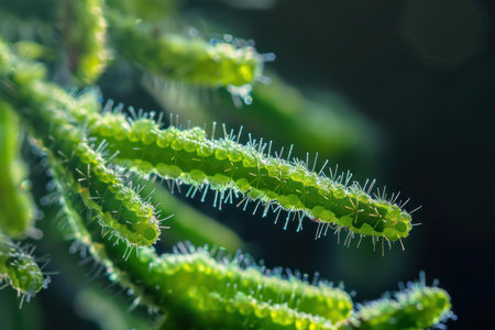 A close up view of green fuzzy plant segments clinging to a branch surrounded by lush foliage in bright daylight.