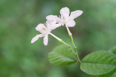 Mok flowers have white color with blur natural background. Beautiful Wrightia flower look lean and fresh on green leaves in the garden.