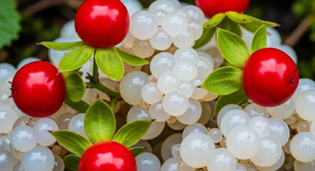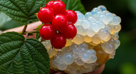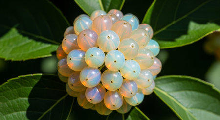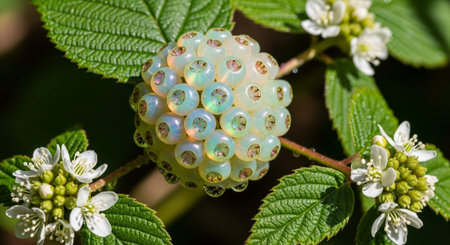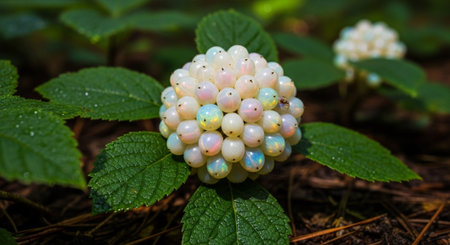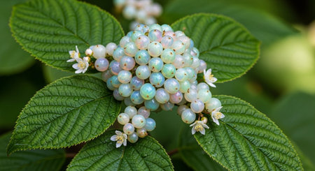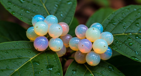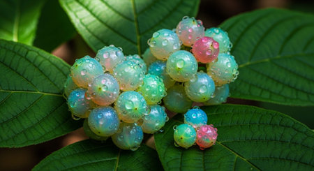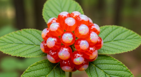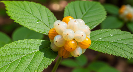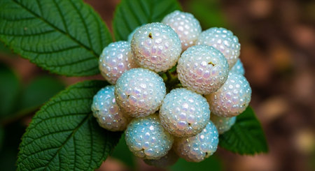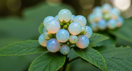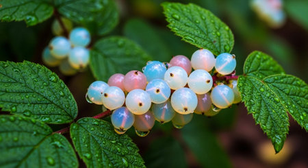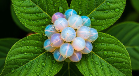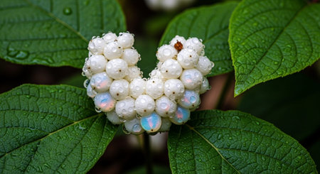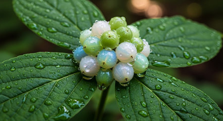 Macro image of rhatany plant leaves glistening with morning dew