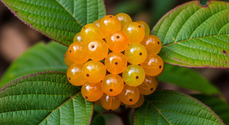 Close-up of several small, vibrant yellow berries hanging from a branch of a plant with green leaves. The berries appear ripe and freshly grown. The background is gently out of focus.