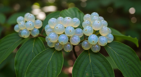 Elegant white blossoms with star-like petals emerge gently among lush green foliage, set against a blurred, tranquil garden backdrop.