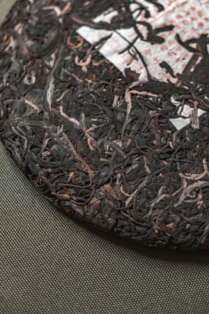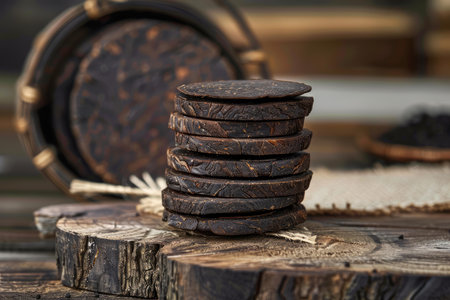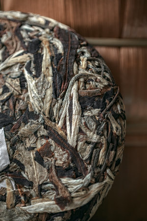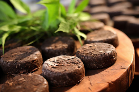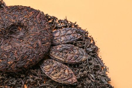 Close-up of pressed Chinese fermented Pu erh tea with a selective focus, capturing its aromatic qual