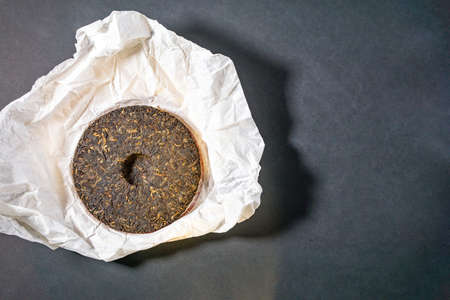 Chinese Tea Shu Shen Puer. Close-up. Pressed Tea. top view flat lay