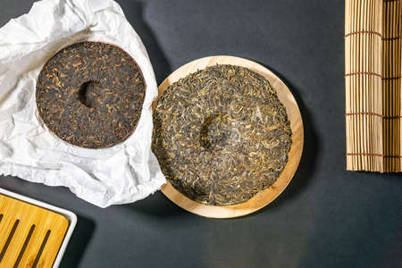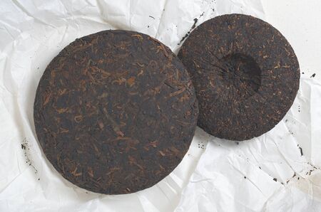 Chinese pressed PU-erh tea, pressed tea top view of a flat lay. Sheng Puer and Shu Puer
