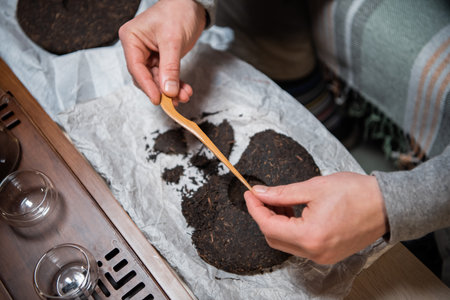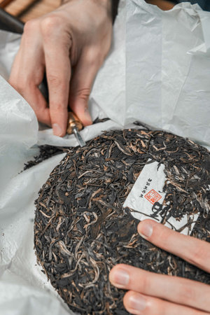 Chinese pu-erh tea. Selective focus on breaking a pressed circle of pu-erh tea. Close up, macro photography.
