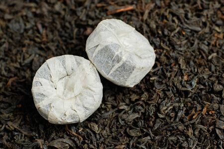 Two pressed tea tablets wrapped in white wrapping paper on background of black tea. Concept of a tea shop.