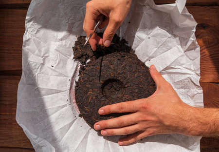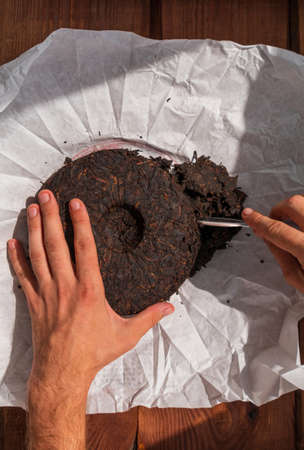 Shu Puerh cake chinese fermented black tea in white paper with knife. Male hands hold chip break pressed old round form ripened dark pu-erh into pieces Healthy invigorating drinks coffee substitute.